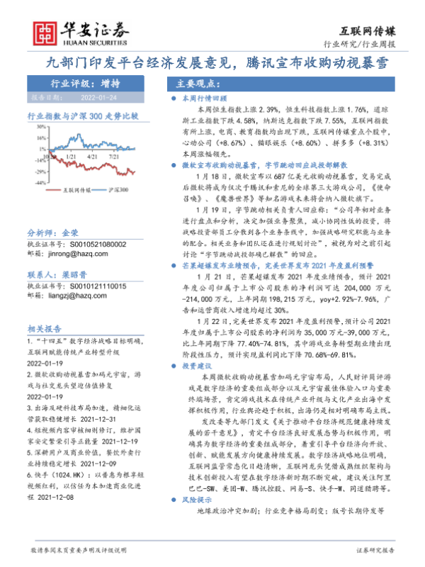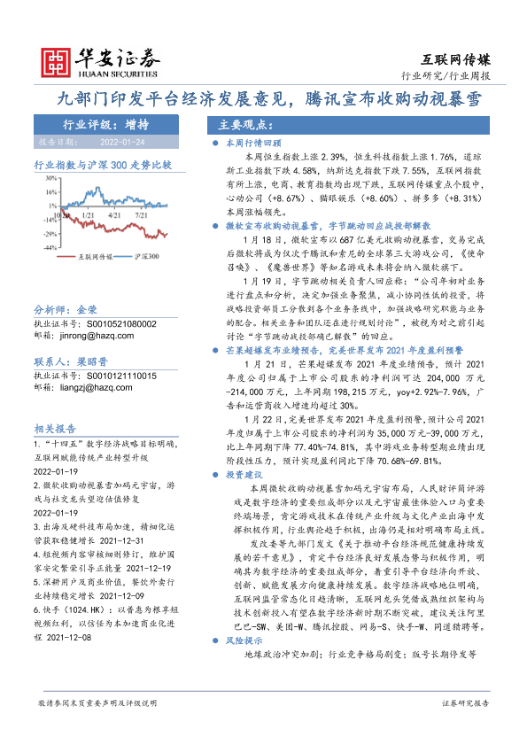 【华安证券】【20220124】互联网传媒行业周报:九部门印发平台经济发展意见,腾讯宣布收购动视暴雪-18页