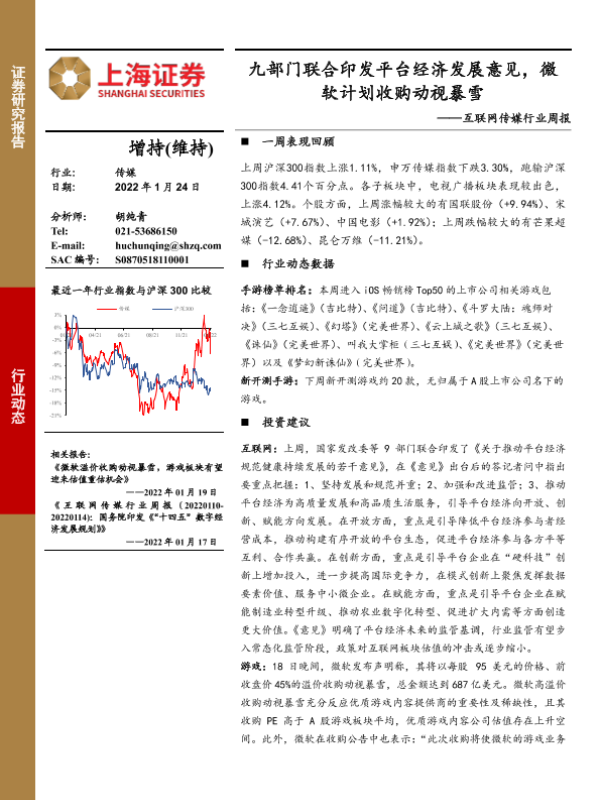 【上海证券】【20220124】互联网传媒行业周报:九部门联合印发平台经济发展意见,微软计划收购动视暴雪-11页