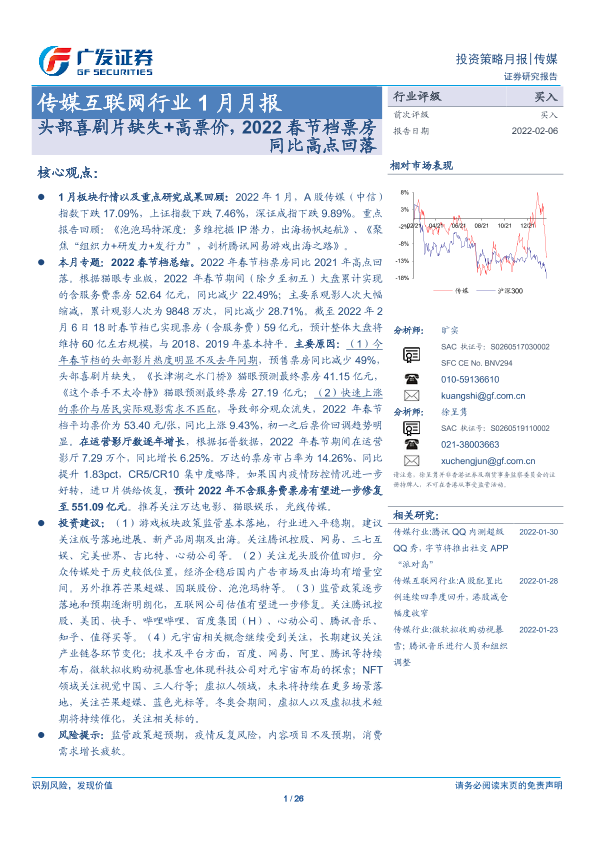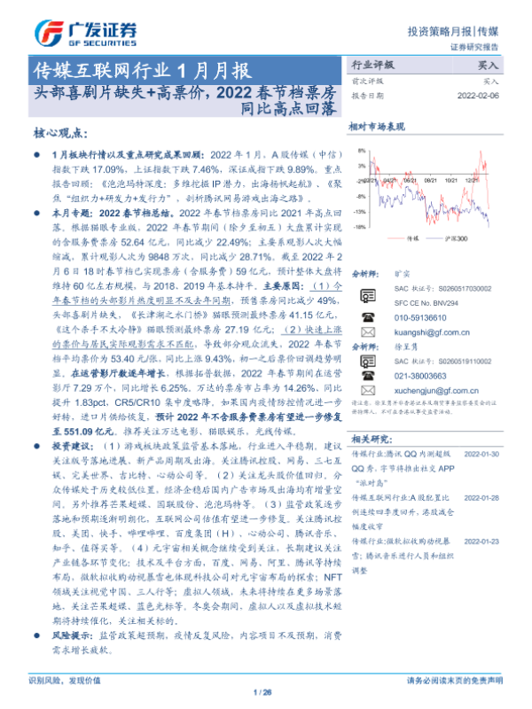 【广发证券】【20220206】2022年1月传媒互联网行业月报:头部喜剧片缺失+高票价,2022春节档票房同比高点回落-26页