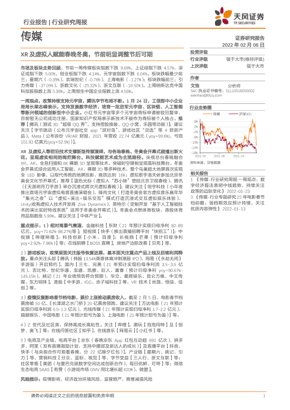 【天风证券】【20220206】XR及虚拟人赋能春晚冬奥,节前明显调整节后可期-13页