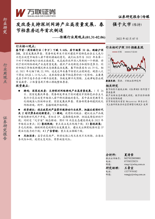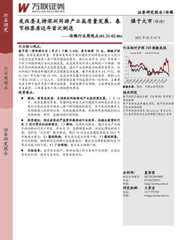 【万联证券】【20220207】发改委支持深圳网游产业高质量发展,春节档票房近年首次倒退-13页