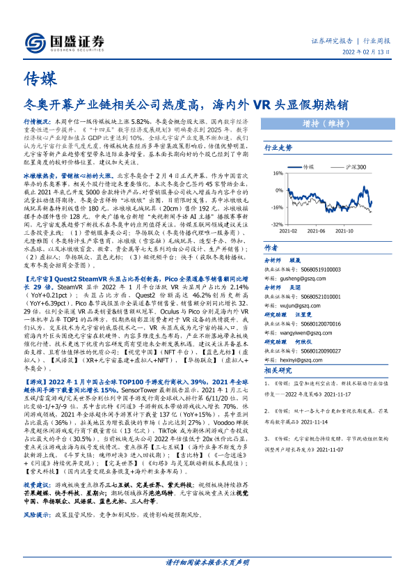 【国盛证券】【20220213】传媒:冬奥开幕产业链相关公司热度高,海内外VR头显假期热销-14页