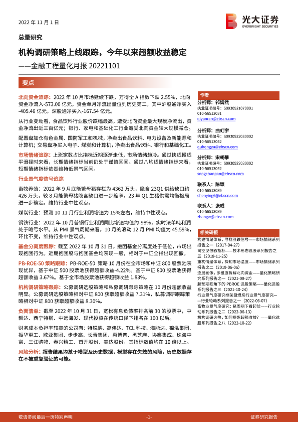 【光大证券】【20221101】金融工程量化月报:机构调研策略上线跟踪,今年以来超额收益稳定-21页