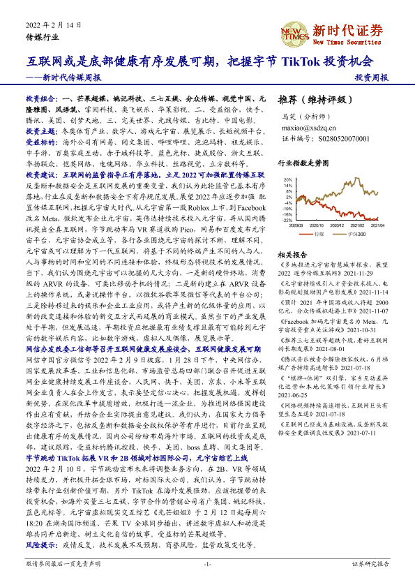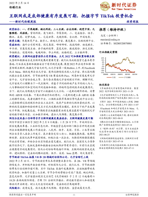 【新时代证券】【20220214】新时代传媒周报:互联网或是底部健康有序发展可期,把握字节TikTok投资机会-30页