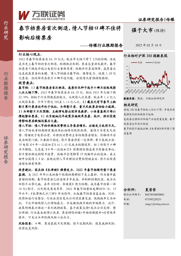 【万联证券】【20220218】春节档票房首次倒退,情人节档口碑不佳将影响后续票房-9页