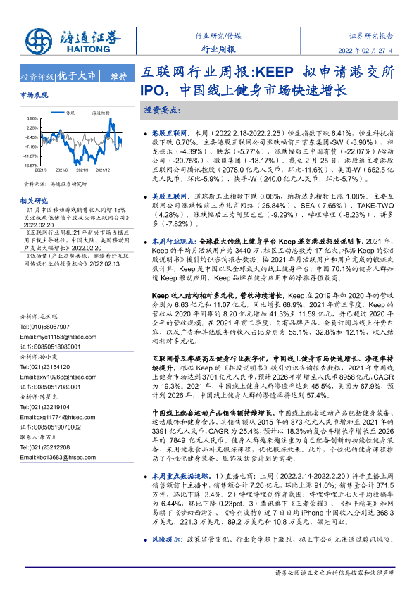 【海通证券】【20220227】互联网行业周报:KEEP拟申请港交所IPO,中国线上健身市场快速增长-9页