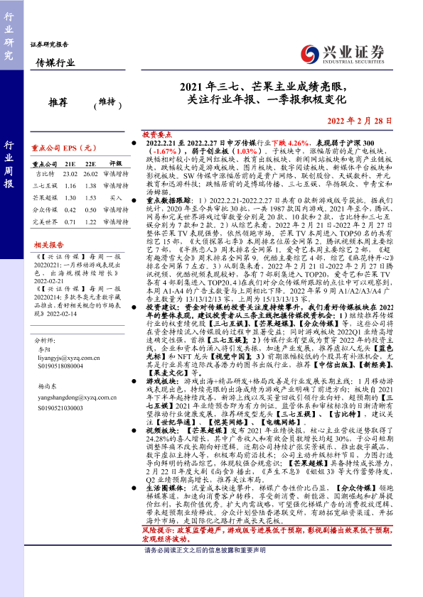 【兴业证券】【20220228】2021年三七、芒果主业成绩亮眼,关注行业年报、一季报积极变化-19页