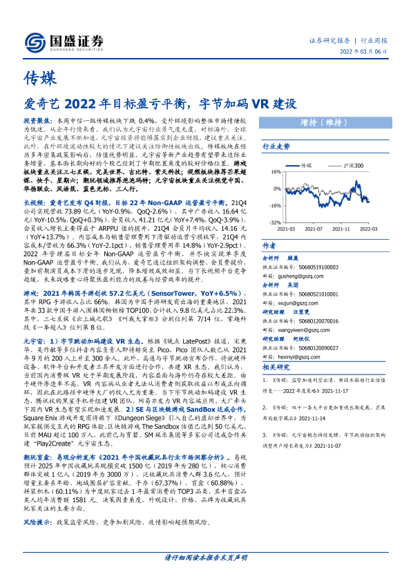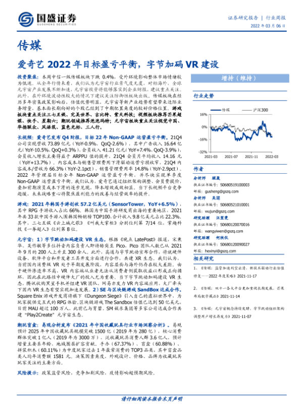 【国盛证券】【20220306】传媒行业周报:爱奇艺2022年目标盈亏平衡,字节加码VR建设-13页
