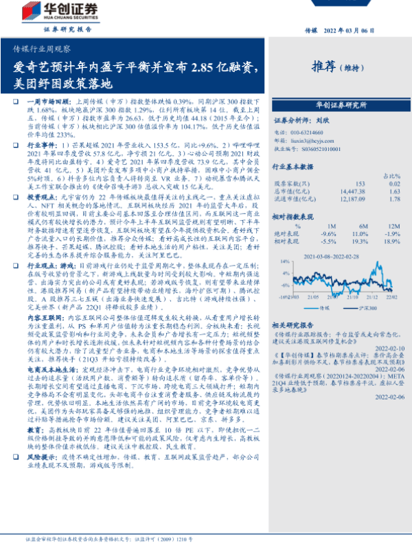 【华创证券】【20220306】传媒行业周观察:爱奇艺预计年内盈亏平衡并宣布2.85亿融资,美团纾困政策落地-22页