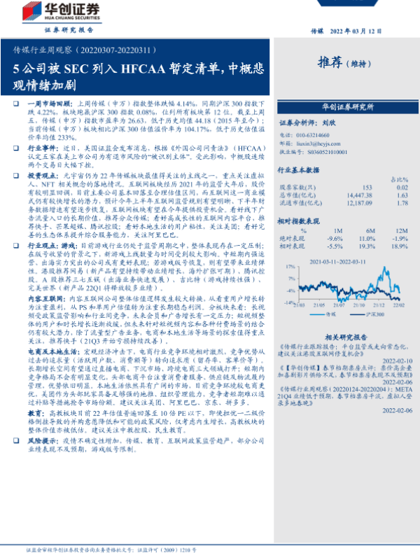 【华创证券】【20220312】传媒行业周观察:5公司被SEC列入HFCAA暂定清单,中概悲观情绪加剧-20页