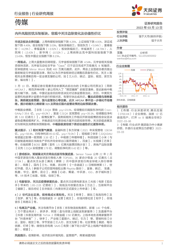 【天风证券】【20220313】传媒行业研究周报:内外风险担忧压制板块,悲观中关注边际变化及估值性价比-14页