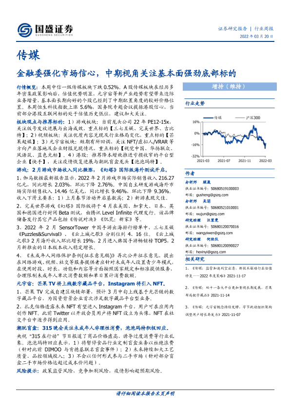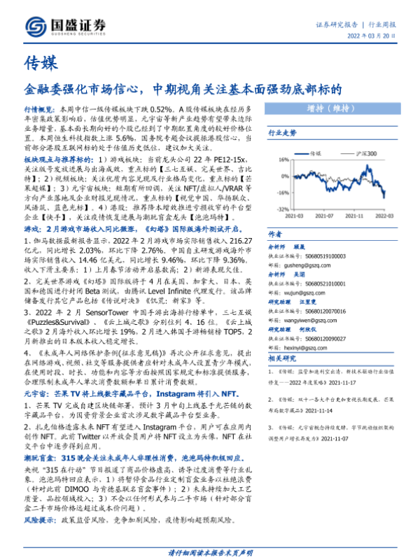 【国盛证券】【20220320】传媒行业周报:金融委强化市场信心,中期视角关注基本面强劲底部标的-15页