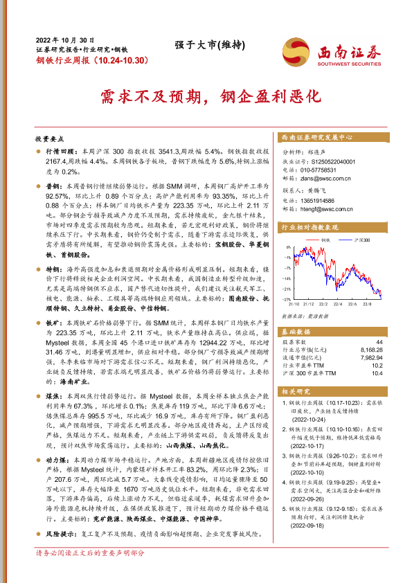 【西南证券】【20221030】钢铁行业周报:需求不及预期,钢企盈利恶化-20页