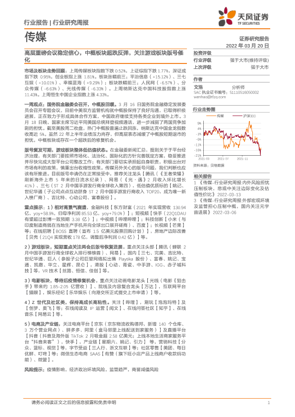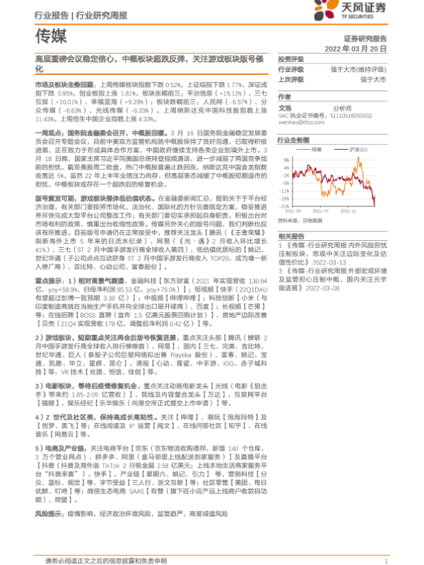 【天风证券】【20220320】传媒行业研究周报:高层重磅会议稳定信心,中概板块超跌反弹,关注游戏板块版号催化-14页