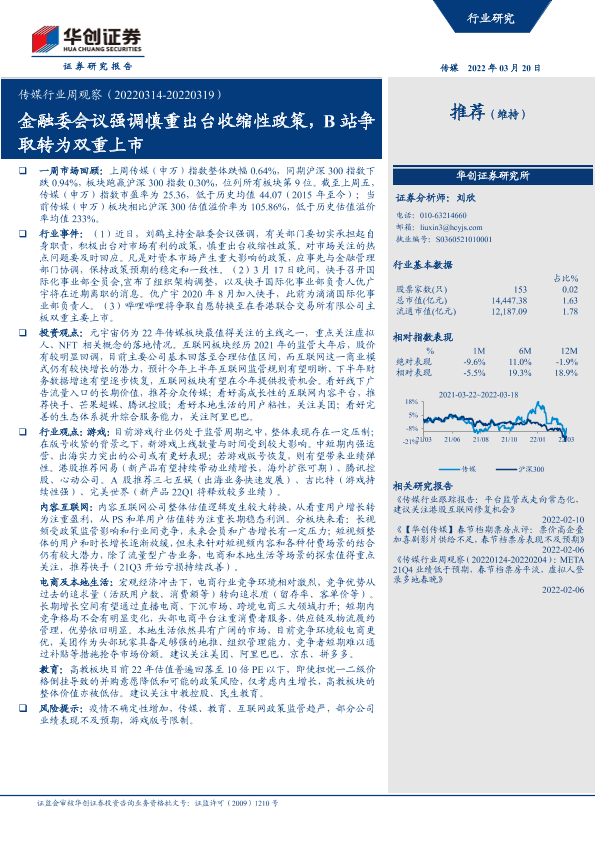 【华创证券】【20220320】传媒行业周观察:金融委会议强调慎重出台收缩性政策,B站争取转为双重上市-22页
