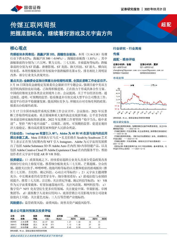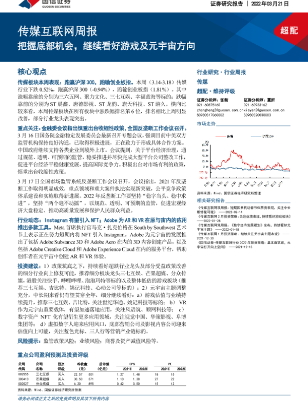【国信证券】【20220321】传媒互联网周报:把握底部机会,继续看好游戏及元宇宙方向-13页