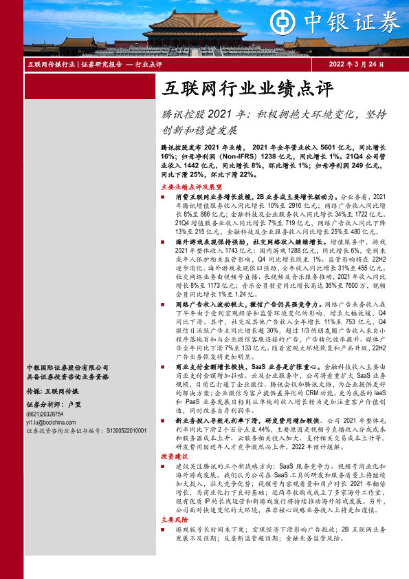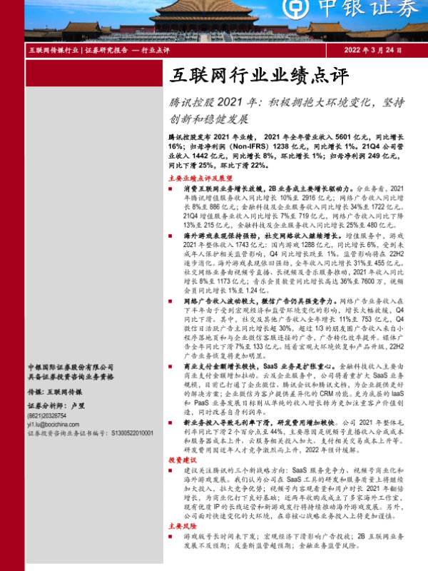 【中银证券】【20220324】腾讯控股2021年:积极拥抱大环境变化,坚持创新和稳健发展-3页