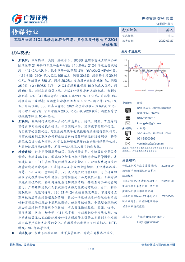 【广发证券】【20220327】传媒行业投资策略周报:互联网公司21Q4业绩总体符合预期,监管及疫情影响下22Q1继续承压-25页
