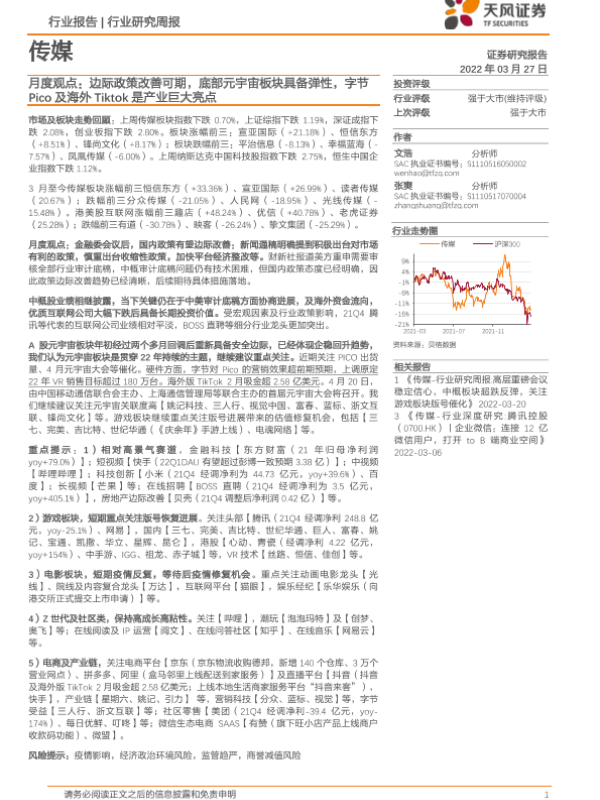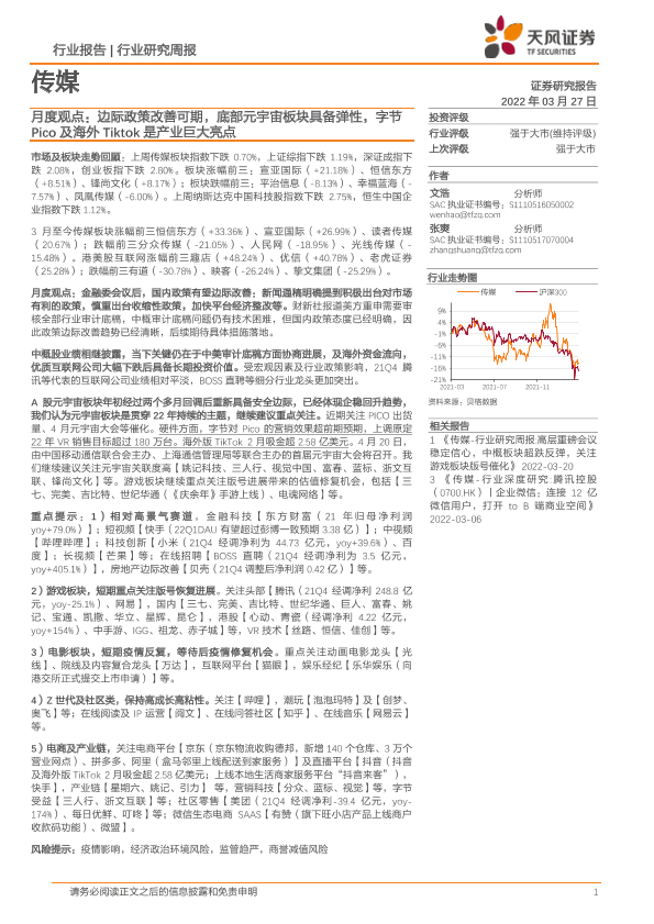 【天风证券】【20220327】传媒月度观点:边际政策改善可期,底部元宇宙板块具备弹性,字节Pico及海外Tiktok是产业巨大亮点-15页