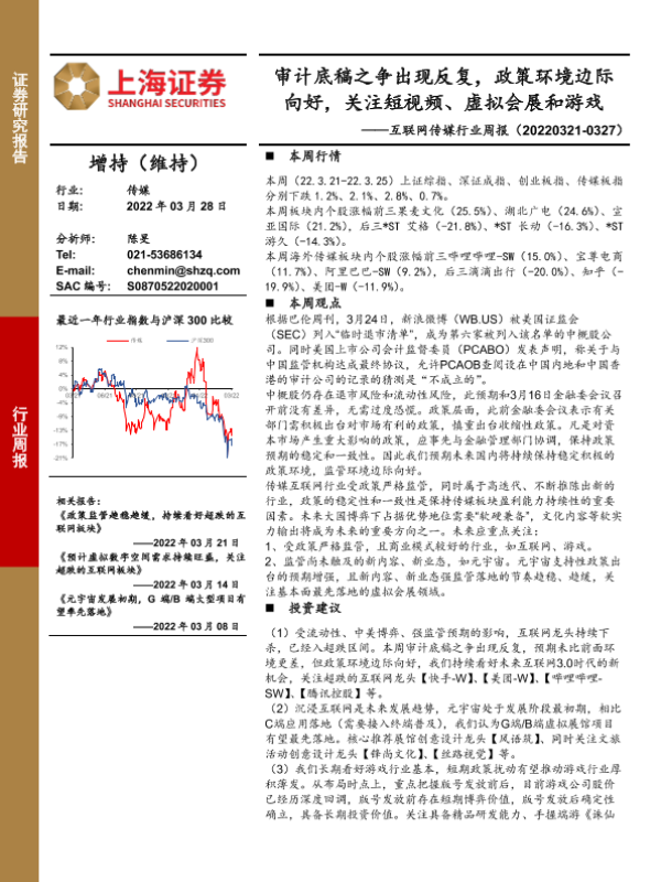 【上海证券】【20220328】互联网传媒行业周报:审计底稿之争出现反复,政策环境边际向好,关注短视频、虚拟会展和游戏-24页