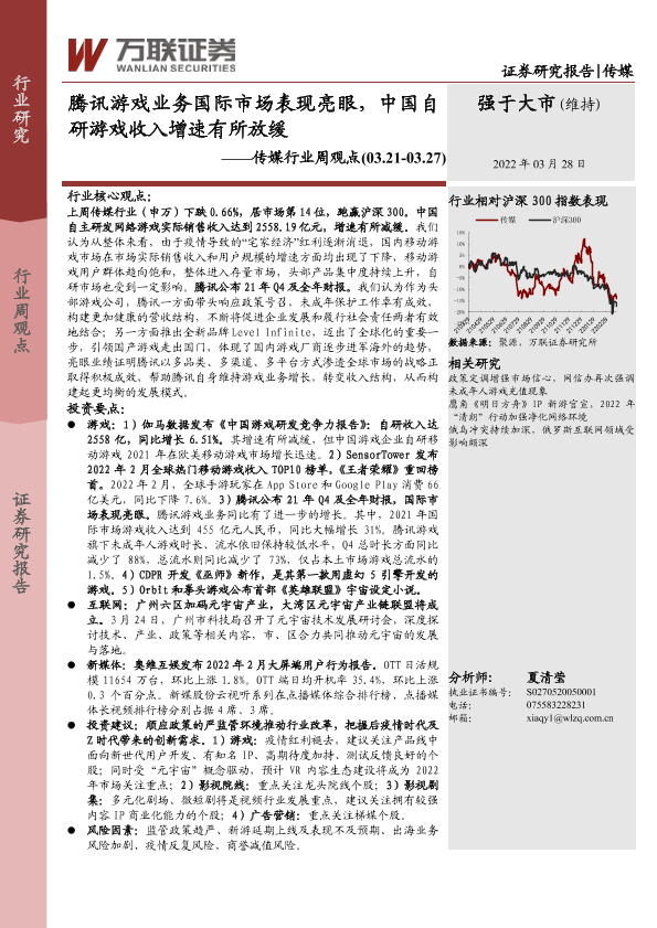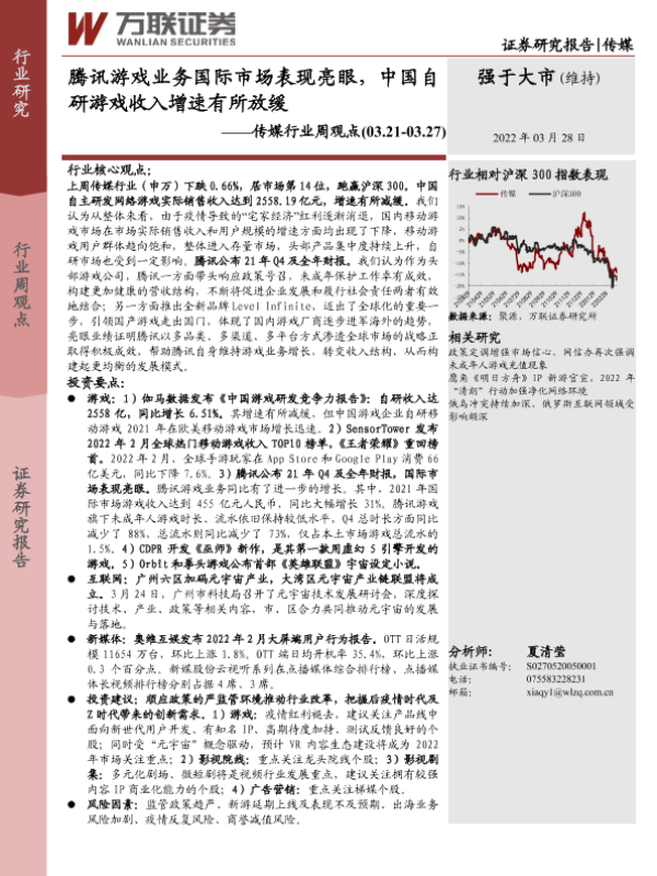 【万联证券】【20220328】腾讯游戏业务国际市场表现亮眼,中国自研游戏收入增速有所放缓-14页