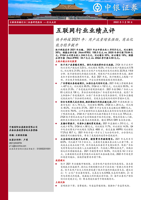 【中银证券】【20220330】互联网行业业绩点评:快手科技2021年用户流量增长强劲,商业化能力稳步提升-3页