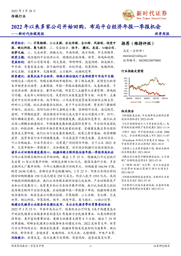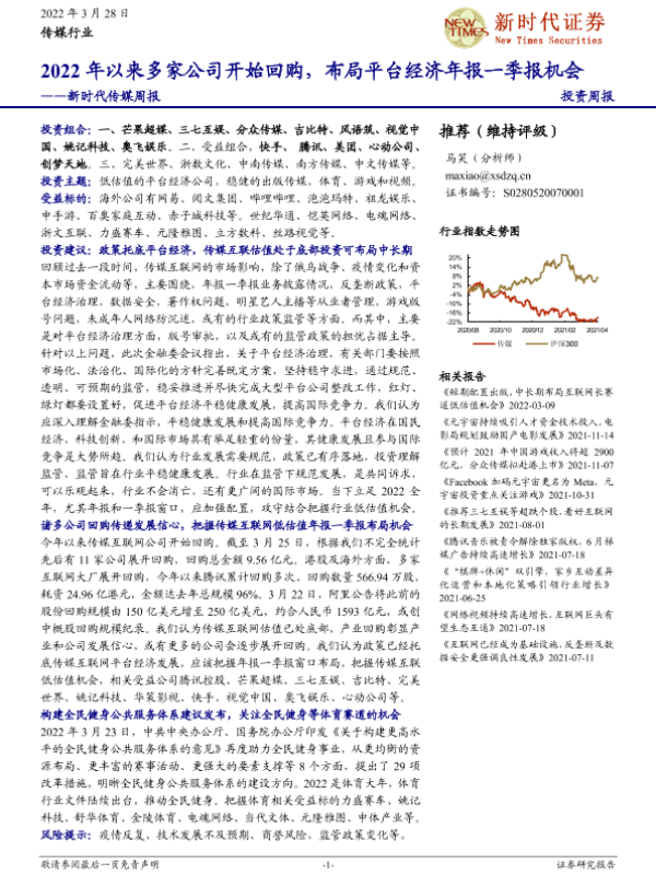 【新时代证券】【20220328】新时代传媒周报:2022年以来多家公司开始回购,布局平台经济年报一季报机会-31页
