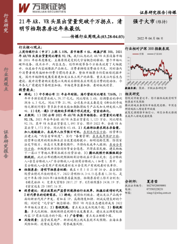 【万联证券】【20220406】21年AR、VR头显出货量突破千万拐点,清明节档期票房近年来最低-14页