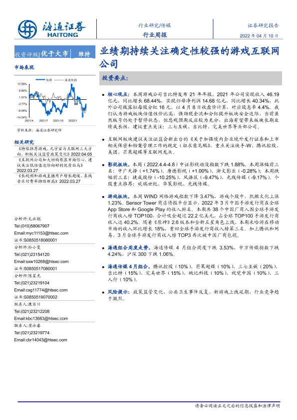 【海通证券】【20220410】传媒行业周报:业绩期持续关注确定性较强的游戏互联网公司-10页