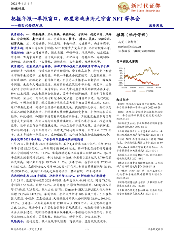 【新时代证券】【20220406】新时代传媒周报:把握年报一季报窗口,配置游戏出海元宇宙NFT等机会-34页
