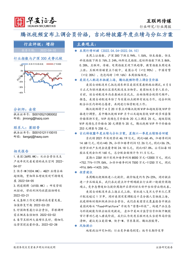 【华安证券】【20220410】互联网传媒行业周报:腾讯视频宣布上调会员价格,吉比特披露年度业绩与分红方案-17页