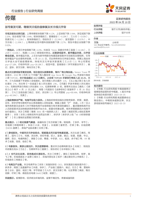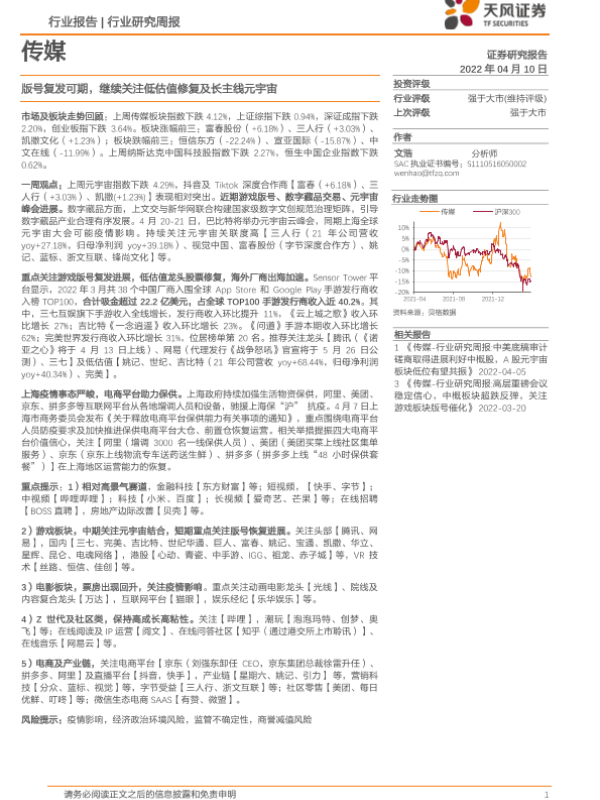 【天风证券】【20220410】传媒行业研究周报:版号复发可期,继续关注低估值修复及长主线元宇宙-14页