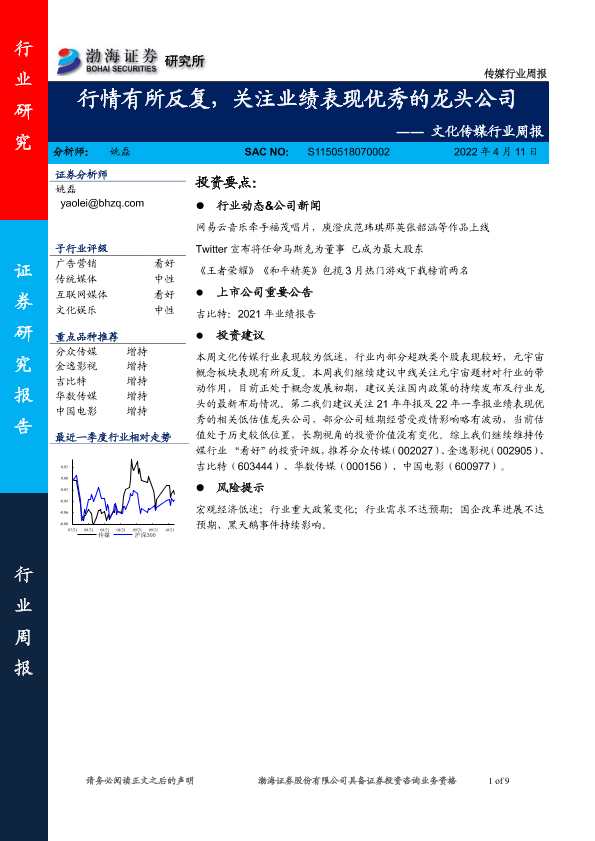 【渤海证券】【20220411】文化传媒行业周报:行情有所反复,关注业绩表现优秀的龙头公司-9页