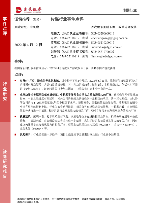 【东莞证券】【20220412】传媒行业事件点评:游戏版号重新下发,政策边际改善-2页