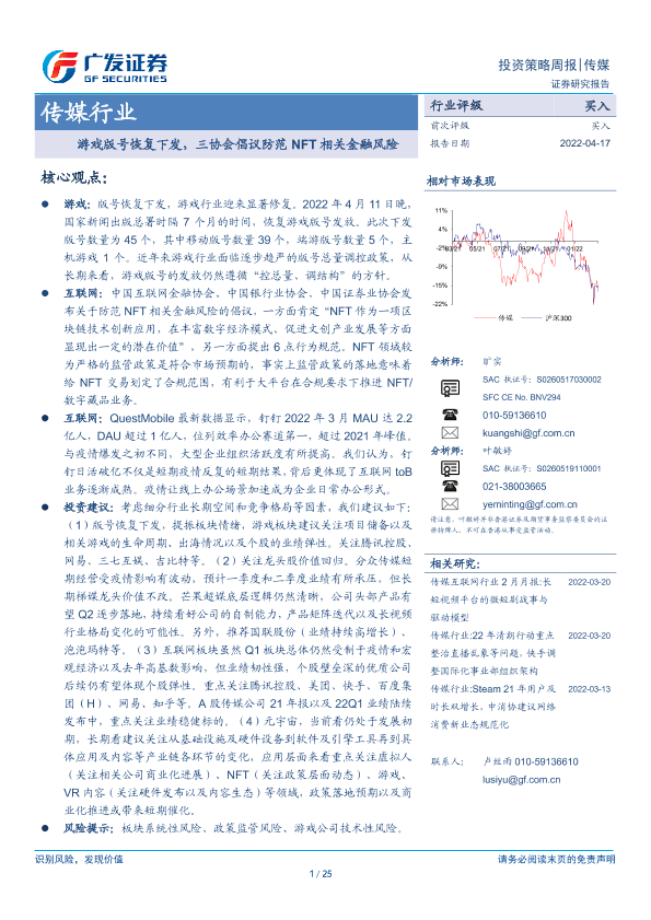 【广发证券】【20220417】游戏版号恢复下发,三协会倡议防范NFT相关金融风险-25页