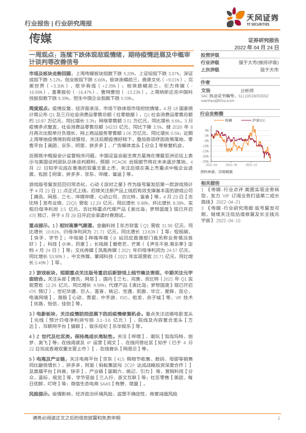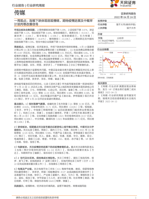 【天风证券】【20220424】传媒一周观点:连续下跌体现悲观情绪,期待疫情进展及中概审计谈判等改善信号-14页