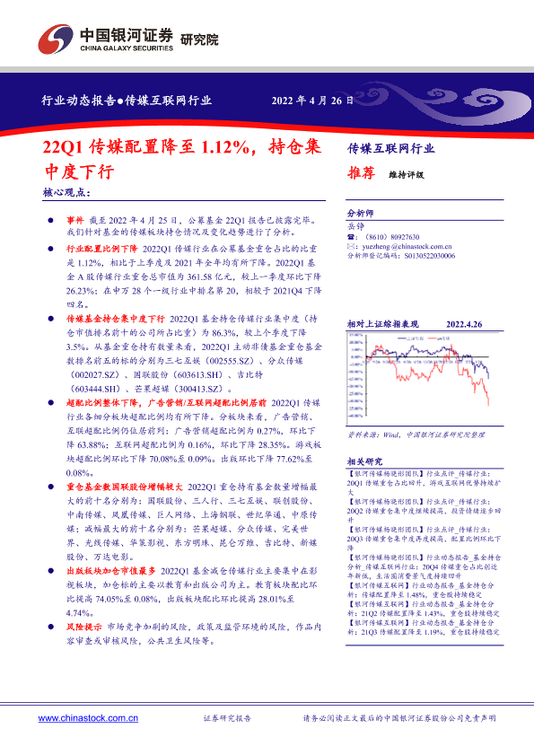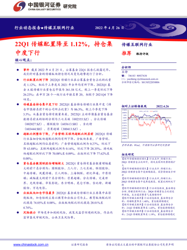 【银河证券】【20220426】22Q1传媒配置降至1.12%,持仓集中度下行-11页