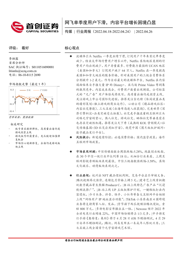 【首创证券】【20220426】网飞单季度用户下滑,内容平台增长困境凸显-16页