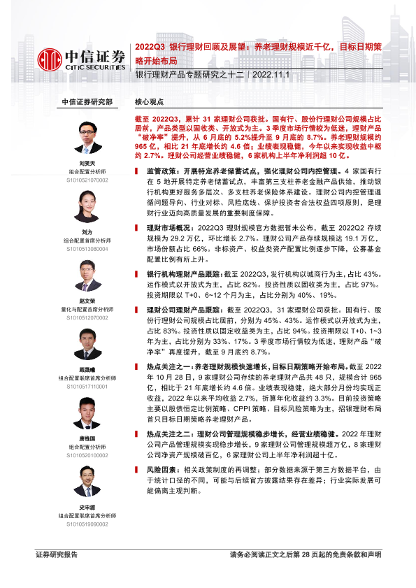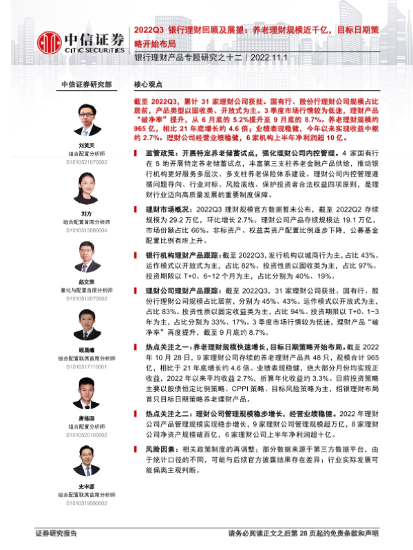 【中信证券】【20221101】银行业理财产品专题研究之十二:2022Q3银行理财回顾及展望,养老理财规模近千亿,目标日期策略开始布局-29页
