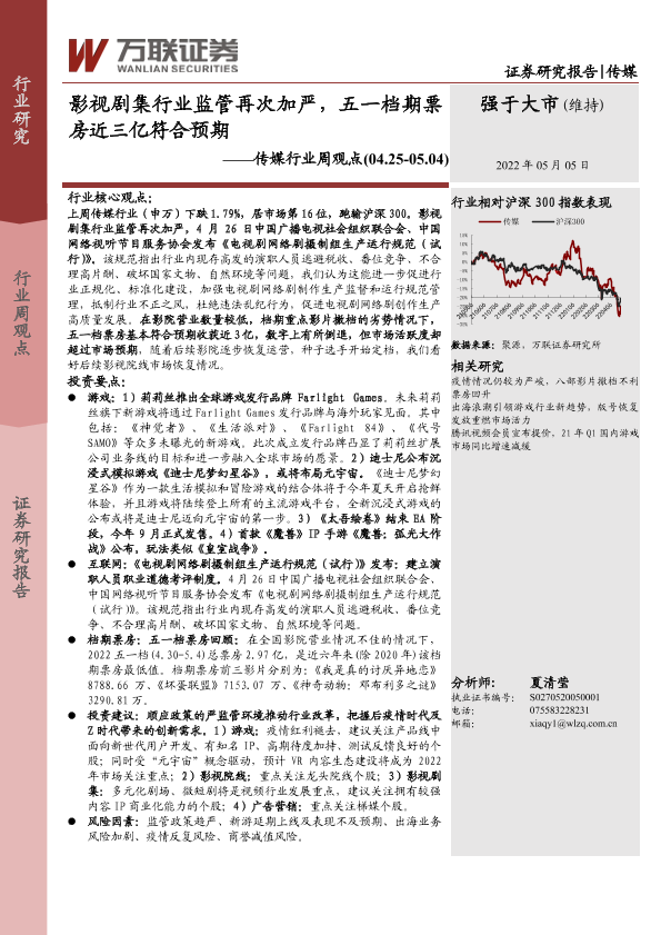 【万联证券】【20220505】影视剧集行业监管再次加严,五一档期票房近三亿符合预期-14页