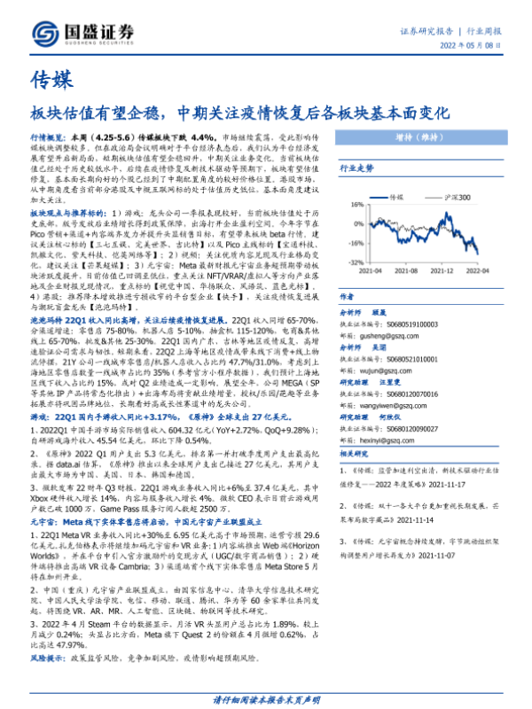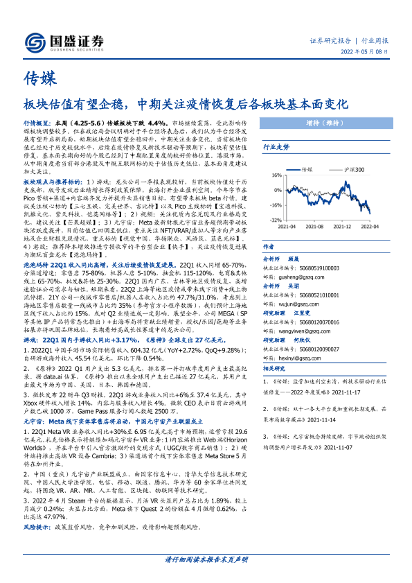 【国盛证券】【20220508】传媒行业周报:板块估值有望企稳,中期关注疫情恢复后各板块基本面变化-15页