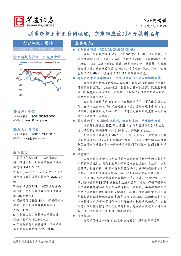 【华安证券】【20220508】互联网传媒行业周报:拼多多探索新业务同城配,京东回应被列入预摘牌名单-17页