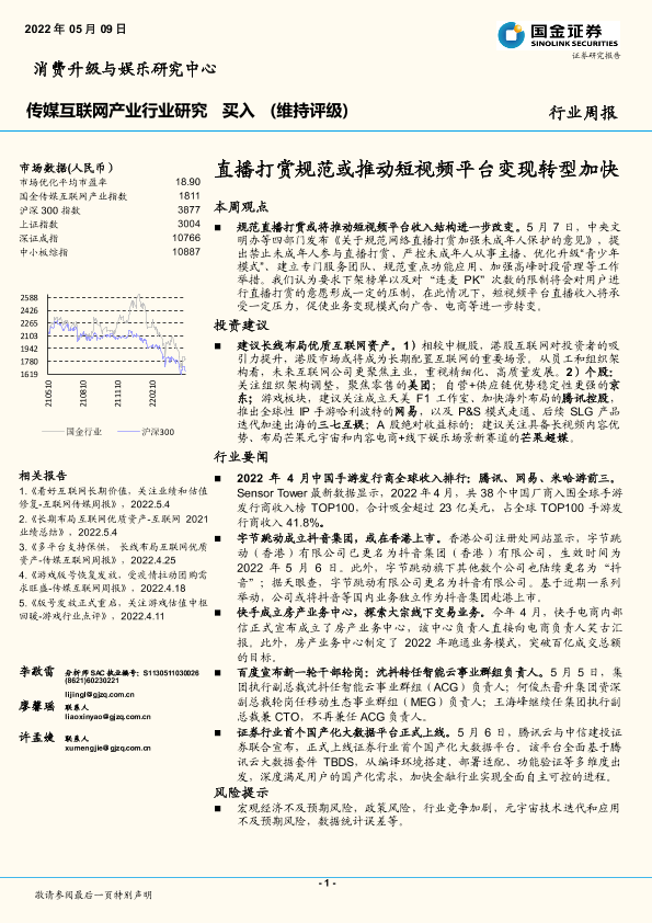 【国金证券】【20220509】传媒互联网产业行业研究:直播打赏规范或推动短视频平台变现转型加快-17页