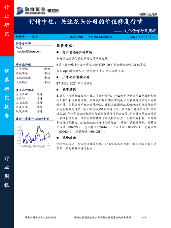 【渤海证券】【20220516】文化传媒行业周报:行情中性,关注龙头公司的价值修复行情-9页