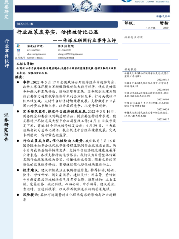 【国泰君安证券】【20220518】传媒互联网行业事件点评:行业政策底夯实,估值性价比凸显-3页