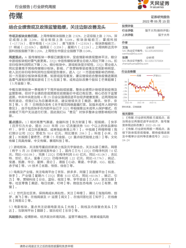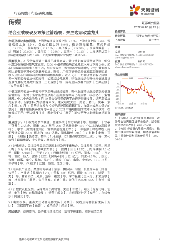 【天风证券】【20220515】传媒行业研究周报:结合业绩表现及政策监管趋缓,关注边际改善龙头-13页