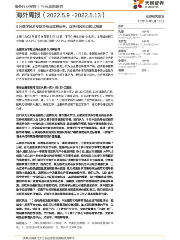 【天风证券】【20220516】5月数字经济专题协商会或将召开,互联网风险回报比较高-10页