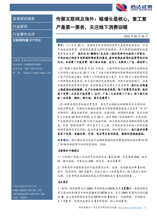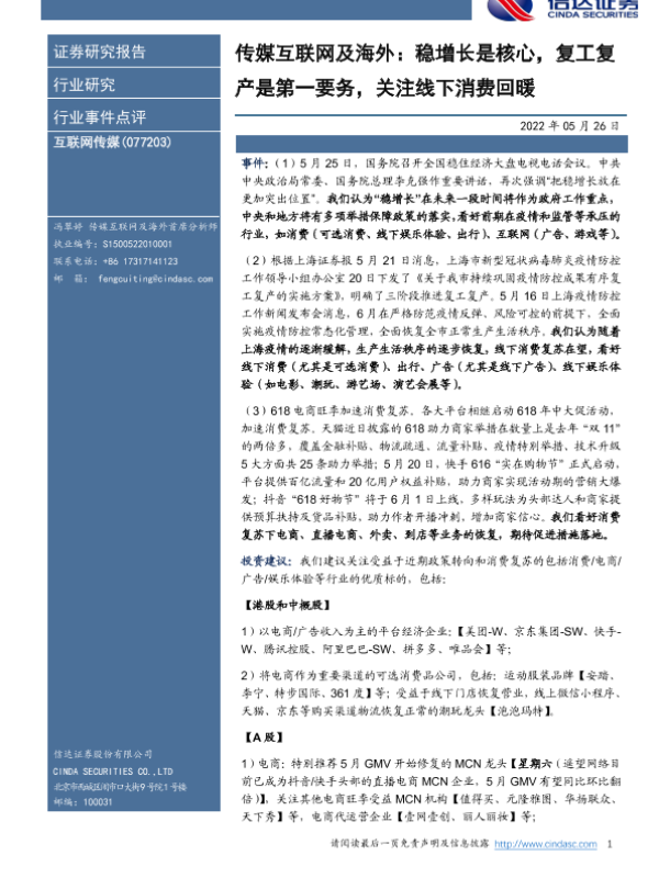 【信达证券】【20220526】传媒互联网及海外:稳增长是核心,复工复产是第一要务,关注线下消费回暖-4页