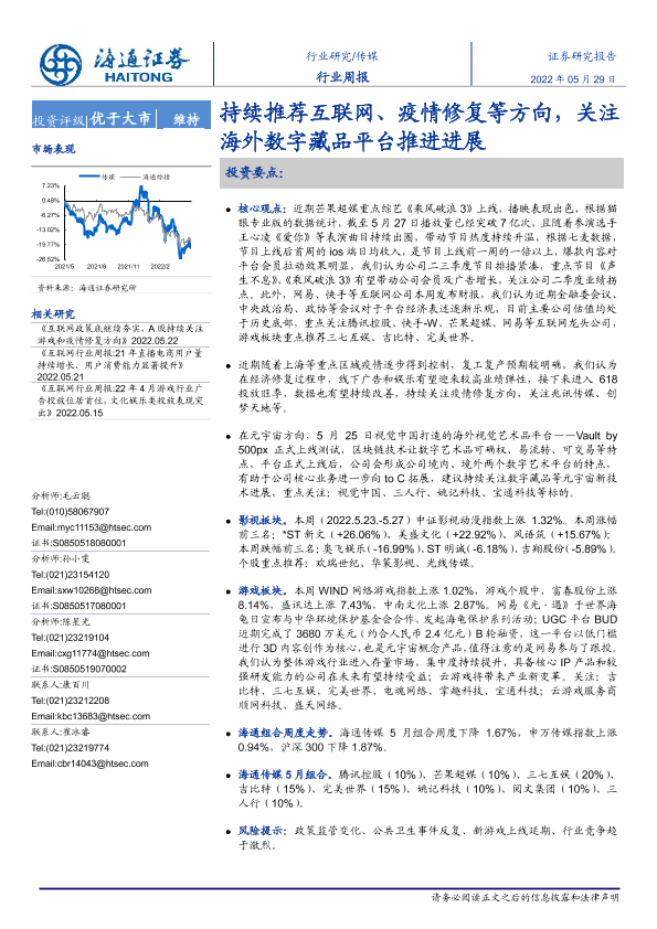 【海通证券】【20220529】传媒行业周报:持续推荐互联网、疫情修复等方向,关注海外数字藏品平台推进进展-10页