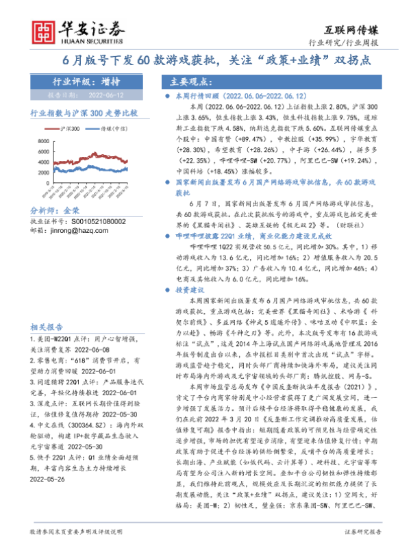 【华安证券】【20220612】互联网传媒行业周报:6月版号下发60款游戏获批,关注“政策+业绩”双拐点-17页